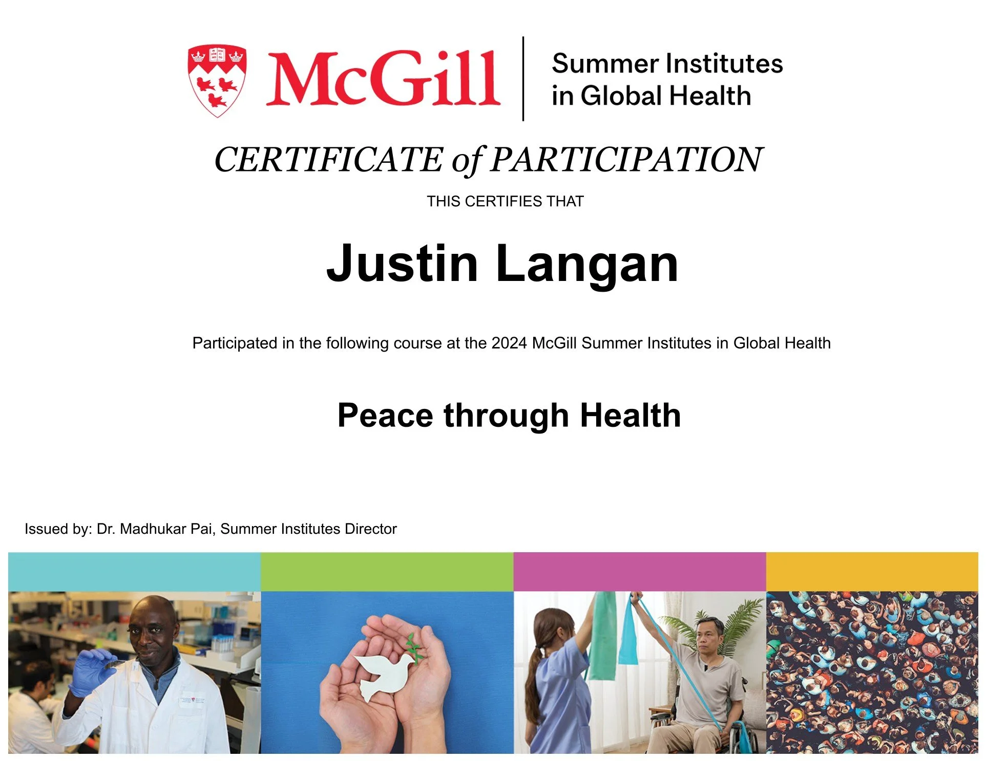 2024 McGill Summer Institutes in Global Health Participant - Completed courses on how conflict and the environment shape human health.